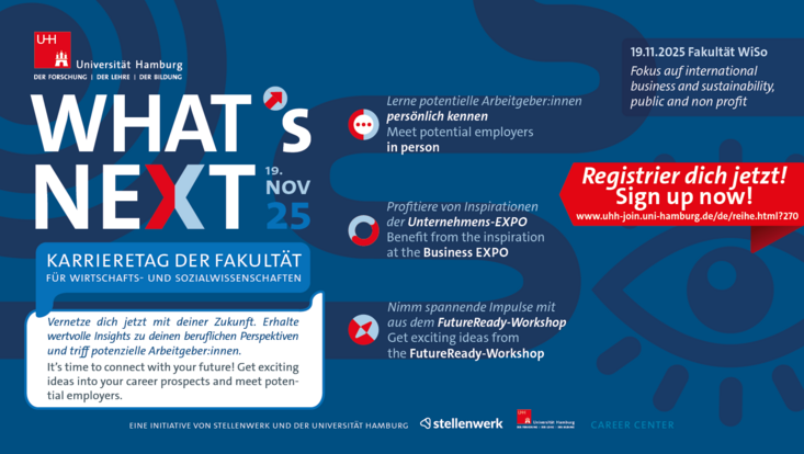 On November 19, 2025, the WHAT’S NEXT KARRIERETAG der Fakultät für Wirtschafts- und Sozialwissenschaften - initiated by stellenwerk and the University of Hamburg - awaits you.