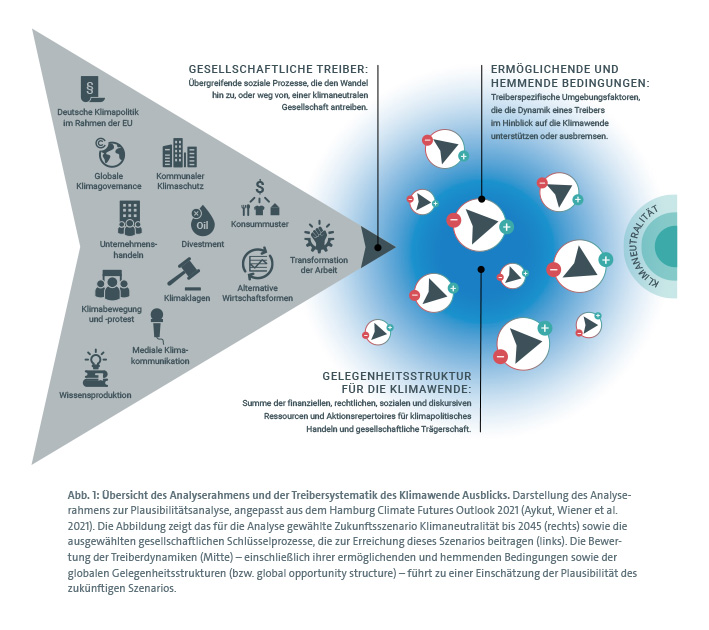 Abb. 1: Übersicht des Analyserahmens und der Treibersystematik des Klimawende Ausblicks. Darstellung des Analyserahmens zur Plausibilitätsanalyse, angepasst aus dem Hamburg Climate Futures Outlook 2021 (Aykut, Wiener et al. 2021). Die Abbildung zeigt das für die Analyse gewählte Zukunftsszenario Klimaneutralität bis 2045 (rechts) sowie die ausgewählten gesellschaftlichen Schlüsselprozesse, die zur Erreichung dieses Szenarios beitragen (links). Die Bewertung der Treiberdynamiken (Mitte) – einschließlich ihrer ermöglichenden und hemmenden Bedingungen sowie der globalen Gelegenheitsstrukturen (bzw. global opportunity structure) – führt zu einer Einschätzung der Plausibilität des zukünftigen Szenarios.