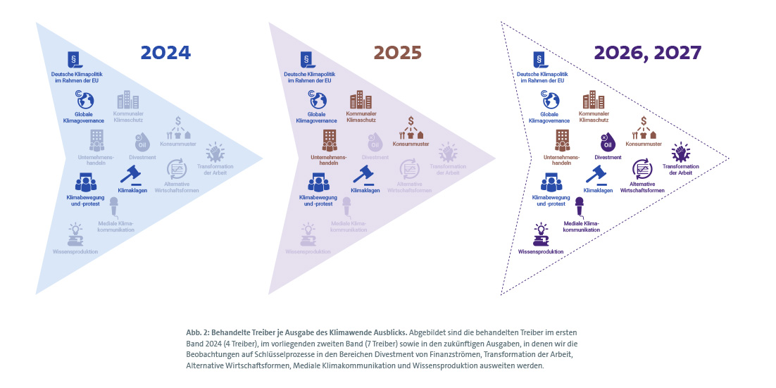 Abb. 2: Behandelte Treiber je Ausgabe des Klimawende Ausblicks. Abgebildet sind die behandelten Treiber im ersten Band 2024 (4 Treiber), im vorliegenden zweiten Band (7 Treiber) sowie in den zukünftigen Ausgaben, in denen wir die Beobachtungen auf Schlüsselprozesse in den Bereichen Divestment von Finanzströmen, Transformation der Arbeit, Alternative Wirtschaftsformen, Mediale Klimakommunikation und Wissensproduktion ausweiten werden.
