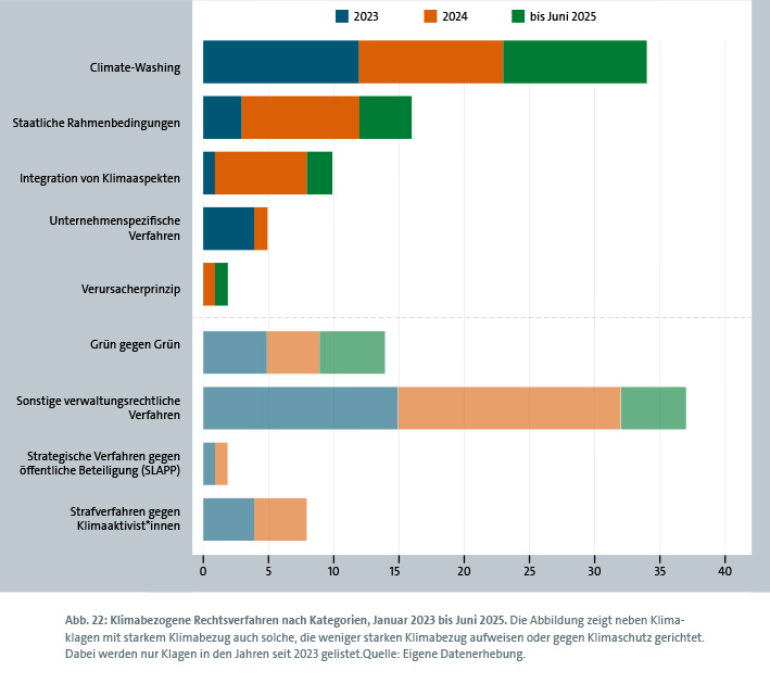 Abb. 22: Klimabezogene Rechtsverfahren nach Kategorien, Januar 2023 bis Juni 2025. Die Abbildung zeigt neben Klimaklagen mit starkem Klimabezug auch solche, die weniger starken Klimabezug aufweisen oder gegen Klimaschutz gerichtet. Dabei werden nur Klagen in den Jahren seit 2023 gelistet. Quelle: Eigene Datenerhebung.