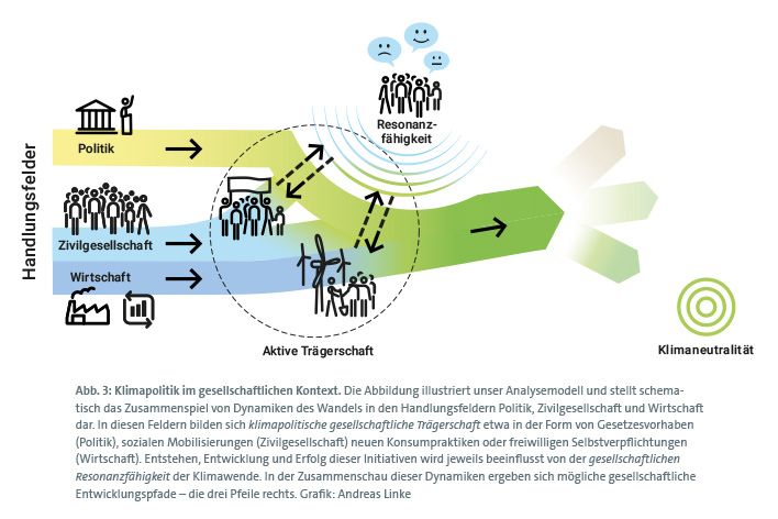 Abb. 3: Klimapolitik im gesellschaftlichen Kontext. Die Abbildung illustriert unser Analysemodell und stellt schematisch das Zusammenspiel von Dynamiken des Wandels in den Handlungsfeldern Politik, Zivilgesellschaft und Wirtschaft dar. In diesen Feldern bilden sich klimapolitische gesellschaftliche Trägerschaft etwa in der Form von Gesetzesvorhaben (Politik), sozialen Mobilisierungen (Zivilgesellschaft) neuen Konsumpraktiken oder freiwilligen Selbstverpflichtungen (Wirtschaft). Entstehen, Entwicklung und Erfolg dieser Initiativen wird jeweils beeinflusst von der gesellschaftlichen Resonanzfähigkeit der Klimawende. In der Zusammenschau dieser Dynamiken ergeben sich mögliche gesellschaftliche Entwicklungspfade – die drei Pfeile rechts.