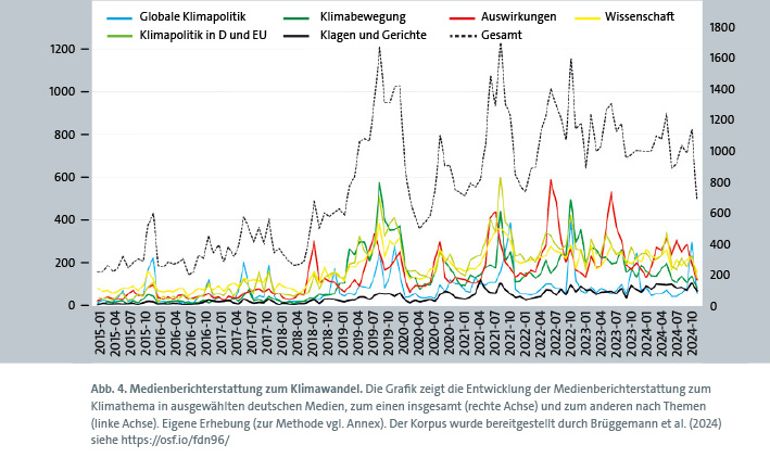 Abb. 4. Medienberichterstattung zum Klimawandel. Die Grafik zeigt die Entwicklung der Medienberichterstattung zum Klimathema in ausgewählten deutschen Medien, zum einen insgesamt (rechte Achse) und zum anderen nach Themen (linke Achse). Eigene Erhebung (zur Methode vgl. Annex). Der Korpus wurde bereitgestellt durch Brüggemann et al. (2024) siehe https://osf.io/fdn96/