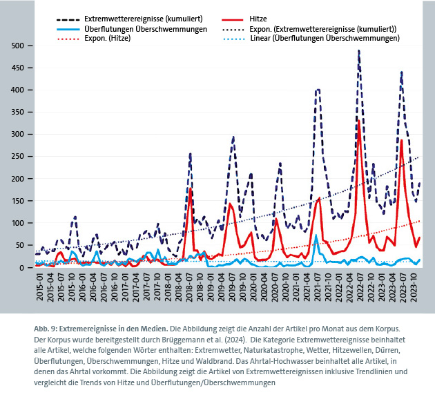 wurde bereitgestellt durch Brüggemann et al. (2024).37 Die Kategorie Extremwettereignisse beinhaltet alle Artikel, welche folgenden Wörter enthalten: Extremwetter, Naturkatastrophe, Wetter, Hitzewellen, Dürren, Überflutungen, Überschwemmungen, Hitze und Waldbrand. Das Ahrtal-Hochwasser beinhaltet alle Artikel, in denen das Ahrtal vorkommt. Die Abbildung zeigt die Artikel von Extremwettereignissen inklusive Trendlinien und vergleicht die Trends von Hitze und Überflutungen/Überschwemmungen.